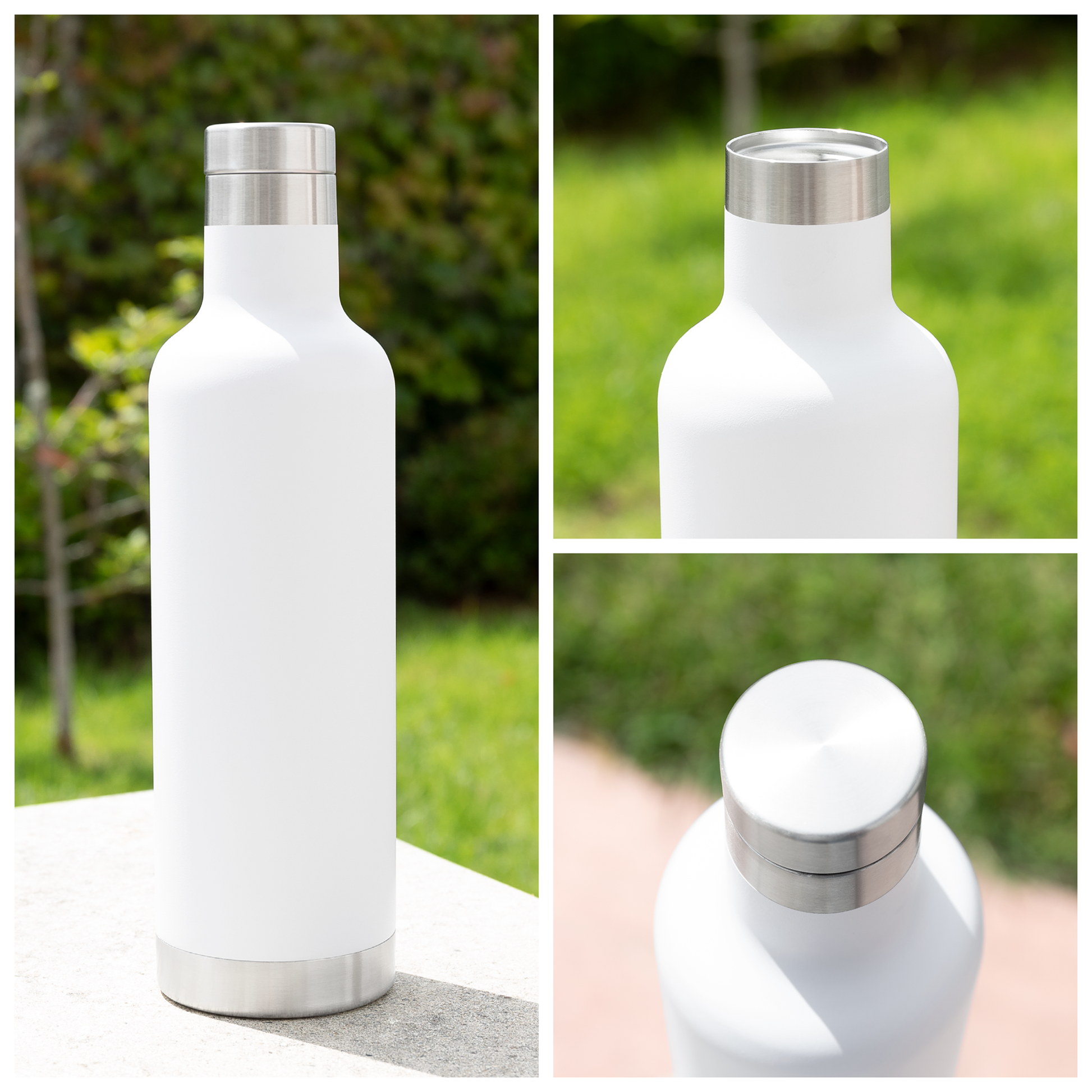 The h2go Noir 25 oz thermal bottle blends sleek style with exceptional function—perfect for wine lovers on the go. Made from double wall 18/8 stainless steel with copper vacuum insulation, it keeps beverages hot or cold for hours. The threaded stainless steel insulated lid and polished rim offer a refined finish, while the powder coated exterior adds durability and grip. Sized to fit a wine bottle, it’s ideal for picnics, outdoor events, or upscale gifting.