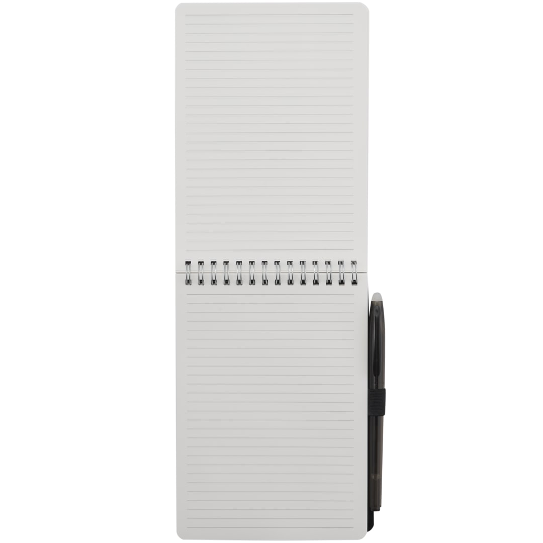 The 5” x 7” Mineral Stone Field Reporter Notebook with Pen features a recycled PP cover, 64 sheets of lined stone paper and silver wire binding. Includes a RPET erasable pen with black ink and elastic pen loop. Through a partnership with 1% For The Planet, one percent of sales of all EcoSmart® products are donated to environmental nonprofits. Note that pens are packed separately.
