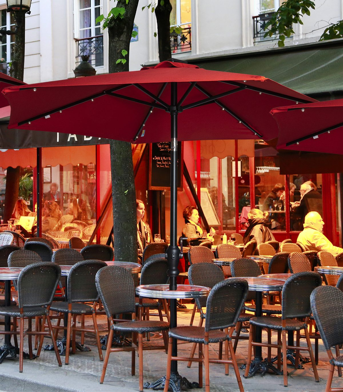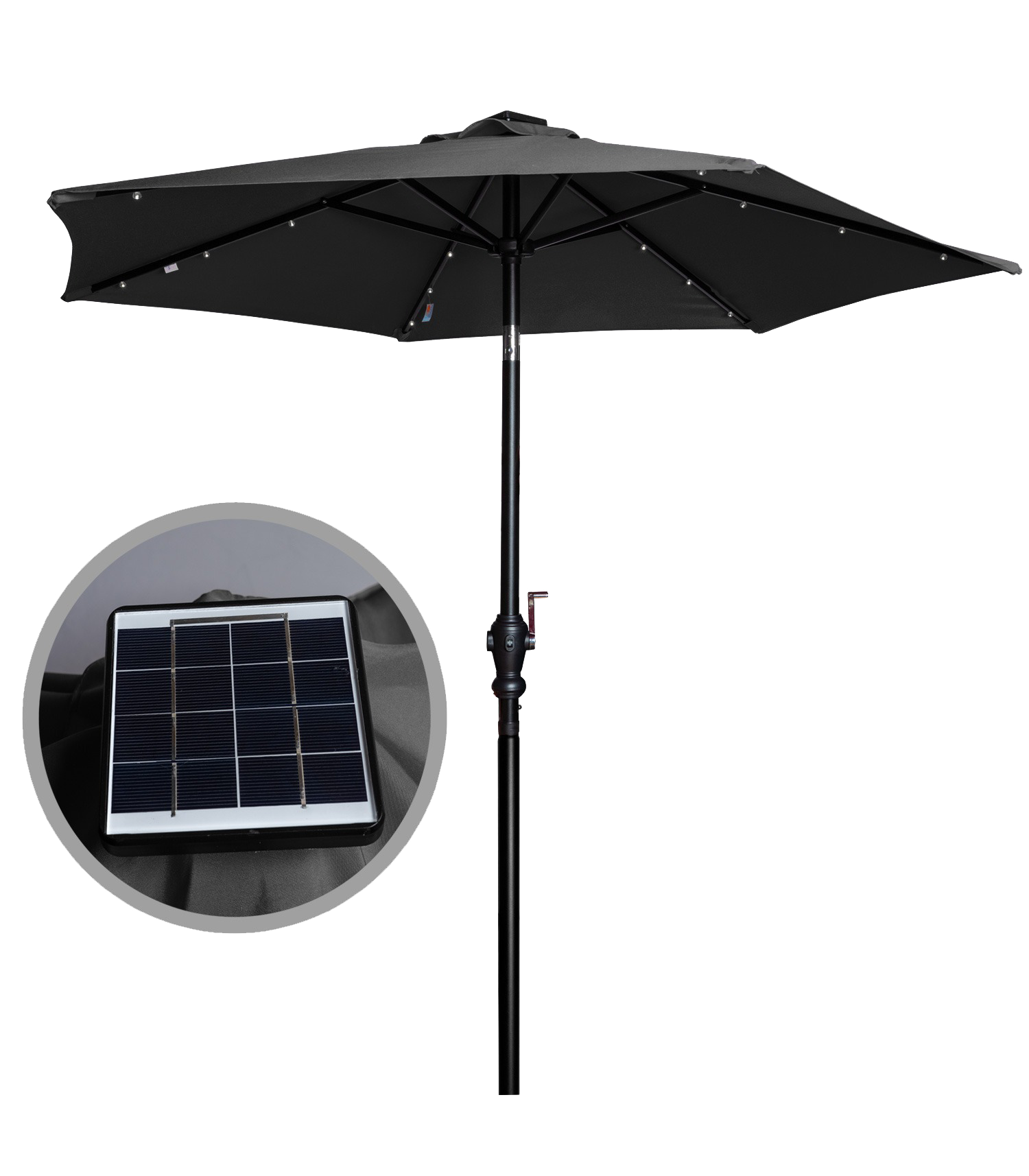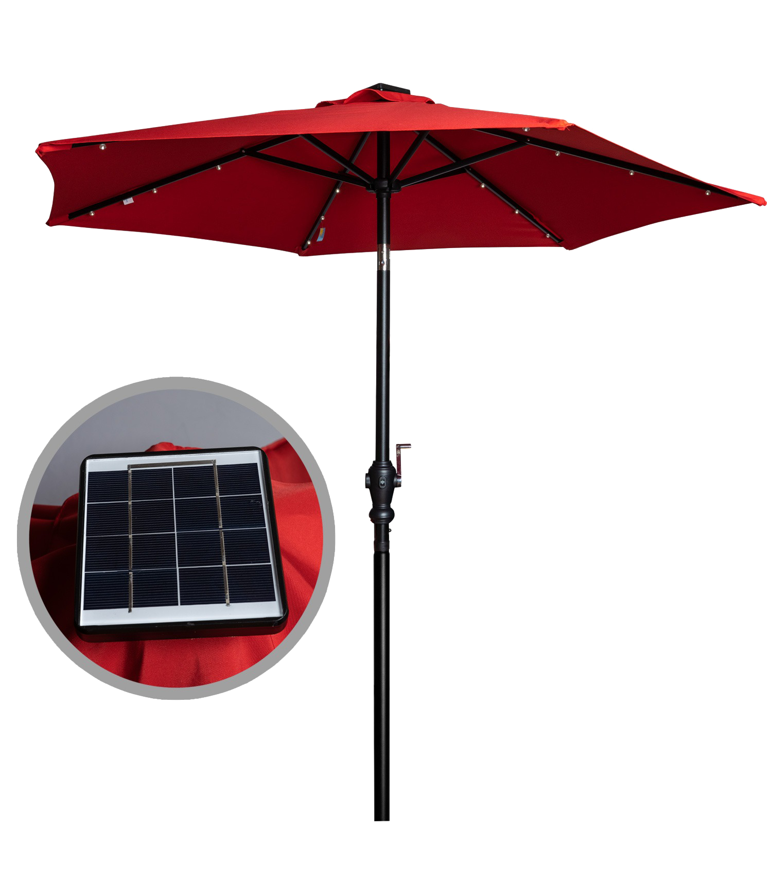 Light up your dining! This market umbrella features solar-charged LED lights on the inside of the canopy, brightly illuminating the area underneath. The hand crank mechanism makes it easy to open and close, and the tilting frame allows you to achieve the best shade angles as the sun moves through the day. Built in battery system provides approximately 4 hours of light up time.