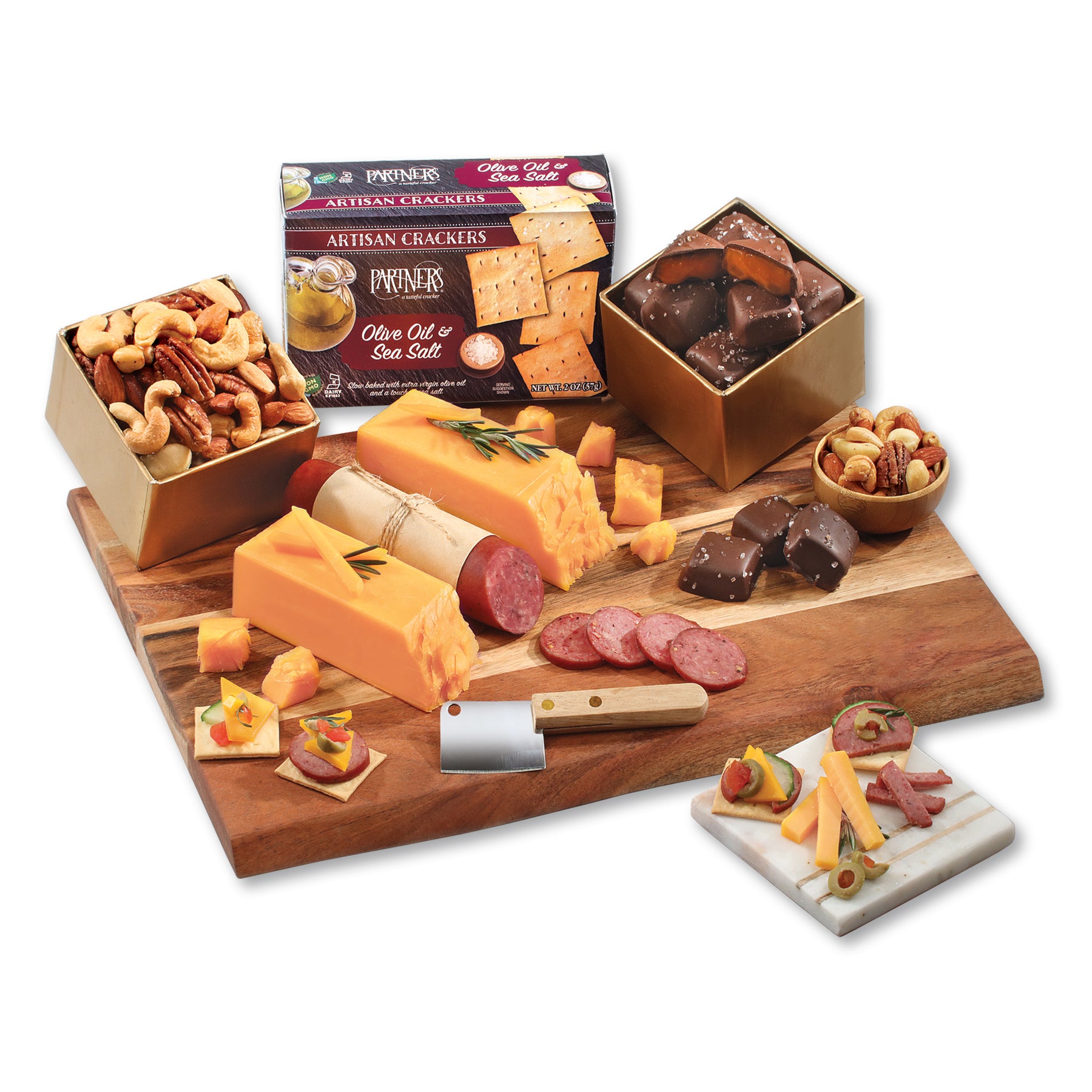 This oversized, sustainable Acacia board (15" x 11.75") is firebranded with your logo and accompanied by some of our amazing favorites. After nibbling on gourmet Wisconsin cheese and sausage, crunch some fresh-roasted deluxe mixed nuts and top off the flavor experience with creamy chocolate sea salt caramels. Snacking doesn't get better than this! Serves 8-12. Contents: Mild Cheddar Cheese, 7 oz. Medium Cheddar Cheese, 7 oz. Beef Summer Sausage, 5 oz. Deluxe Mixed Nuts, 5 oz. Olive Oil & Sea Salt Crackers, 2 oz. 8 Chocolate Sea Salt Caramels, 4.75 oz. Meat & Cheese Cleaver