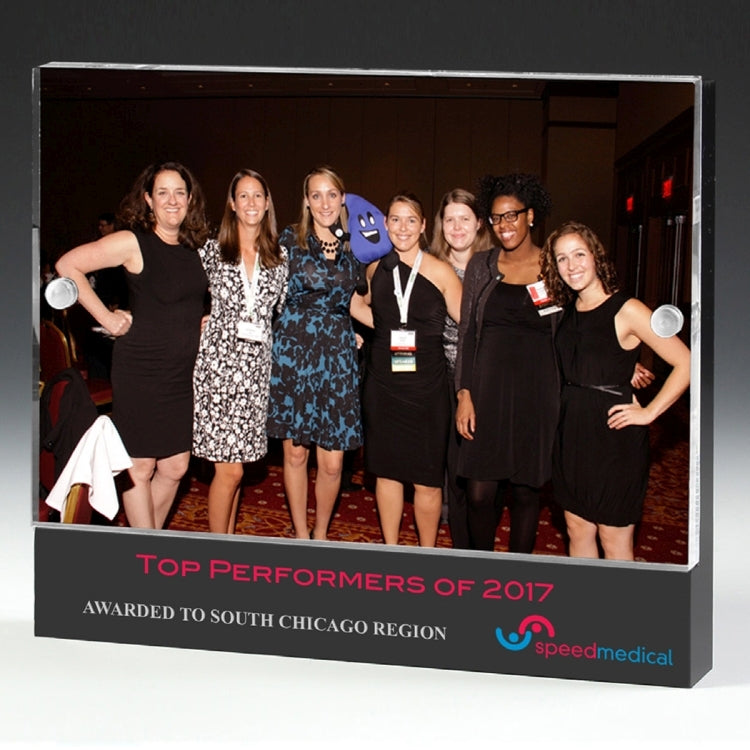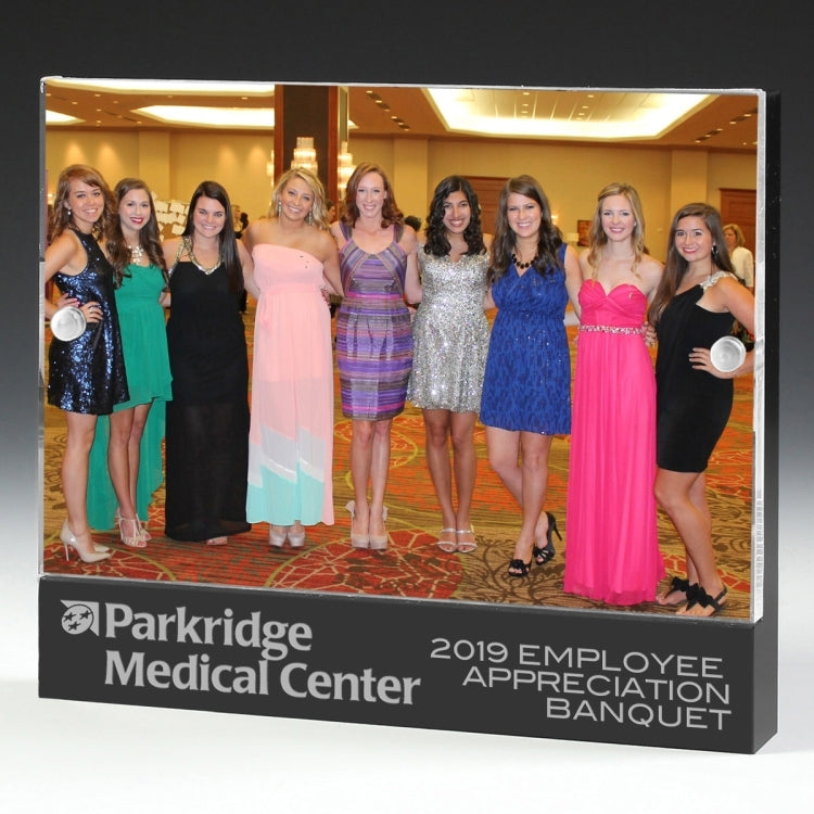 These acrylic frames are held together with small, but powerful, magnets. Your favorite pictures or inserts can easily be positioned inside for proud display. Choose from three popular sizes and include your Screen or laser engraved copy on the black base