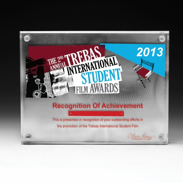 The Alumo Tech plaques feature decorative swirled aluminum mounted on beveled black acrylic. They have an elevated clear acrylic imprint panel which is held in place with decorative chrome hardware. Choose a laser engraved, screen printed or 4 color process imprint on clear acrylic panel.