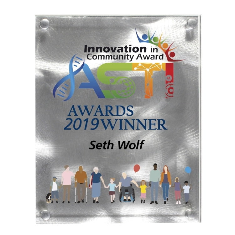 The Alumo Tech plaques feature decorative swirled aluminum mounted on beveled black acrylic. They have an elevated clear acrylic imprint panel which is held in place with decorative chrome hardware. Choose a laser engraved, screen printed or 4 color process imprint on clear acrylic panel.
