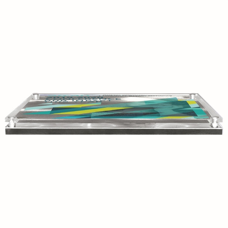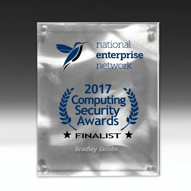 The Alumo Tech plaques feature decorative swirled aluminum mounted on beveled black acrylic. They have an elevated clear acrylic imprint panel which is held in place with decorative chrome hardware. Choose a laser engraved, screen printed or 4 color process imprint on clear acrylic panel.