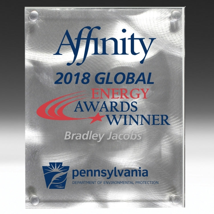 The Alumo Tech plaques feature decorative swirled aluminum mounted on beveled black acrylic. They have an elevated clear acrylic imprint panel which is held in place with decorative chrome hardware. Choose a laser engraved, screen printed or 4 color process imprint on clear acrylic panel.