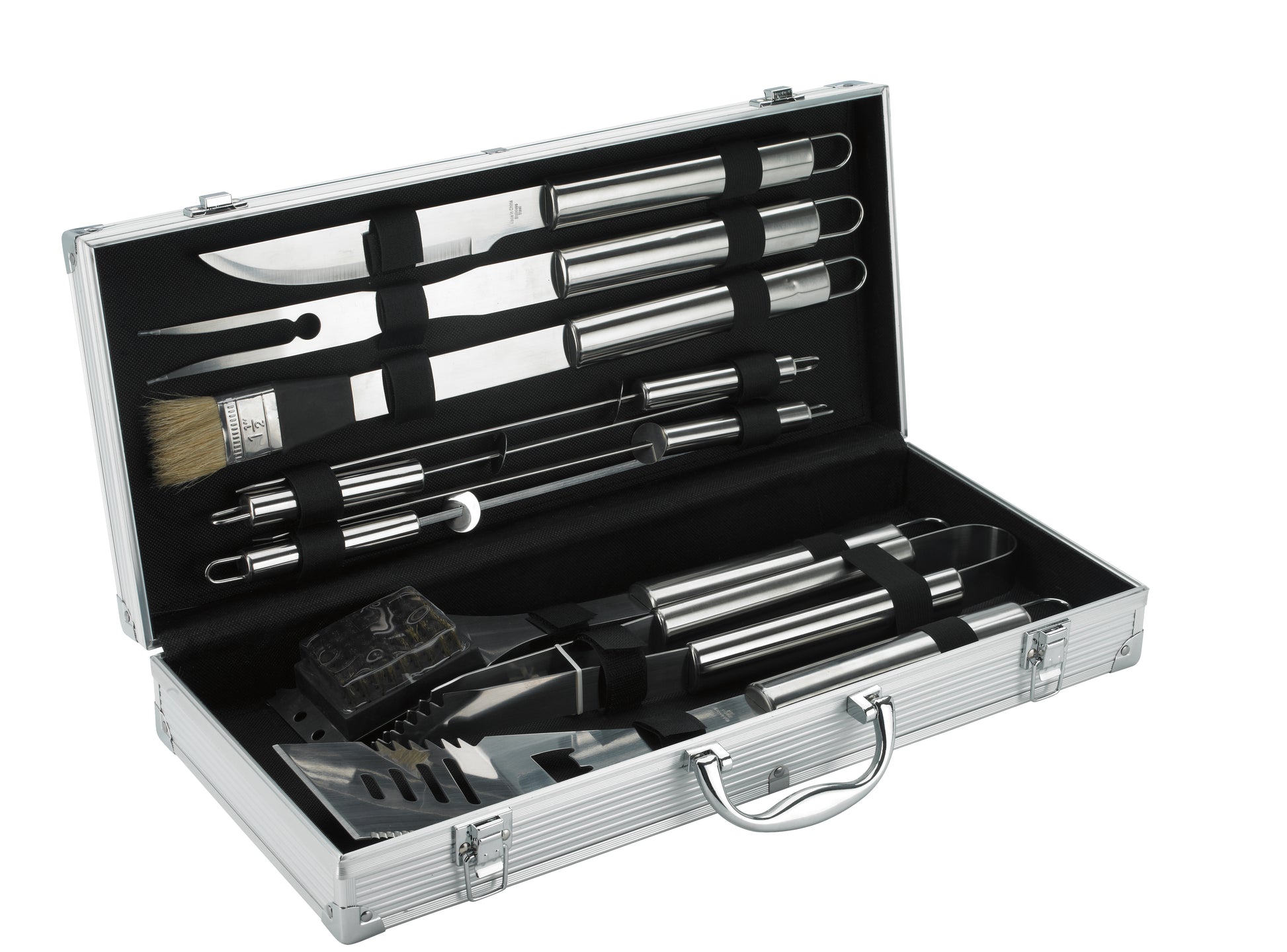 Perfect for your next BBQ, this 10-piece set has everything you need, including tongs, spatula, fork, basting brush, and 4 skewers. And, you can store it all away easily in its sturdy carrying case.