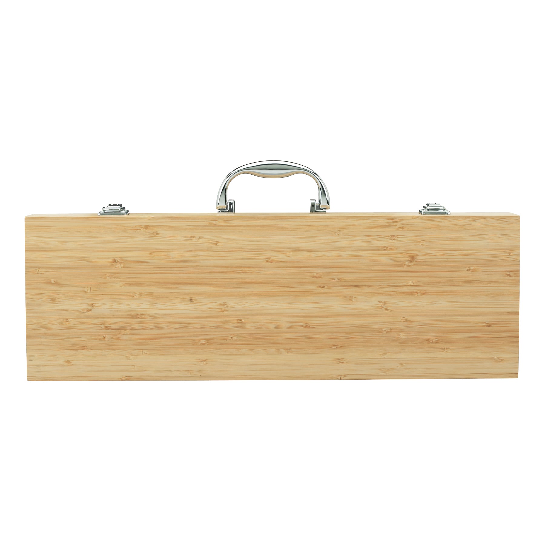 5 piece BBQ set made of bamboo and stainless steel. It includes a serrated-edge spatula with bottle opener, BBQ fork, tongs, knife, and a basting brush.