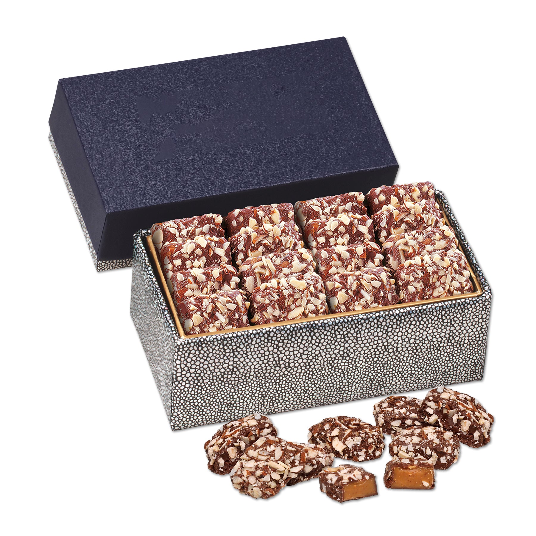 For decades, our customers (and the recipients of their gifts) have raved about our signature English Butter Toffee! We begin with a crunchy toffee center made with plenty of pure, dairy-fresh butter. Then we enrobe each piece in rich, premium chocolate. Finally, we cover it with toasted almonds. With nearly 36 pieces in this one-pound box, there's plenty to share with friends and family... but don't be surprised if they want to keep it all for themselves. We package this great tasting toffee in a navy and silver gift box foil-stamped with your logo in silver on the lid. Contents: 36 pieces of English Butter Toffee, 1 lb.