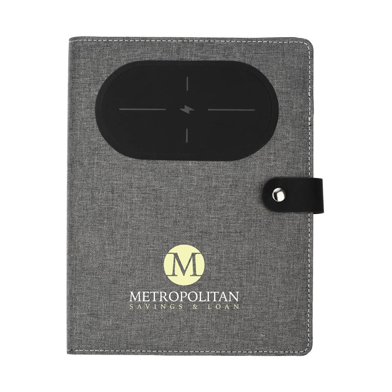The Navigate Notebook has a wireless phone charger, a professional look and is perfect for notetaking in work meetings and conferences. It has 50 sheets of lined paper in the spiral replaceable notebook, an interior pocket for your phone or power bank, an elastic pen loop, elastic cable organizer and an interior slip pocket for notes. Wireless charging enabled phones charge upon contact when notebook charger is plugged into a computer, wall charger or power bank with the included micro USB cable. The wireless phone charger has a 5V/2A Input and 5V/1A Output. The Navigate Notebook is a great gift to welcome new hires!