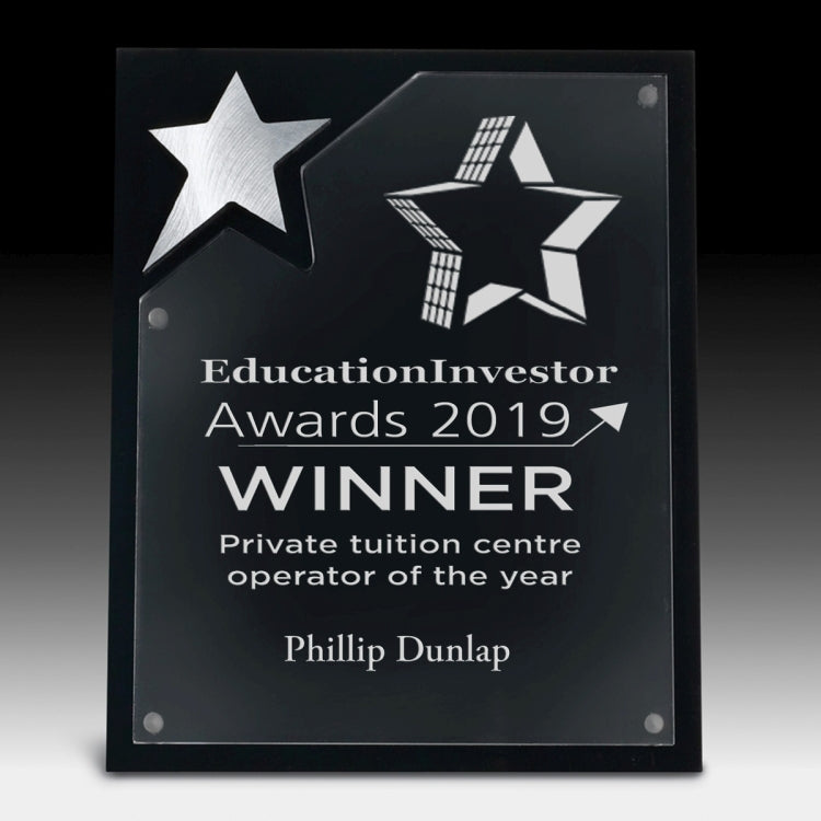 These plaques feature machined and swirled metal stars and solid strips mounted on black polished beveled acrylic. The clear acrylic imprint panel is decorated by Screen Printing, Laser Engraving or 4 Color Process Printed and is elevated and held in place with decorative chrome hardware.