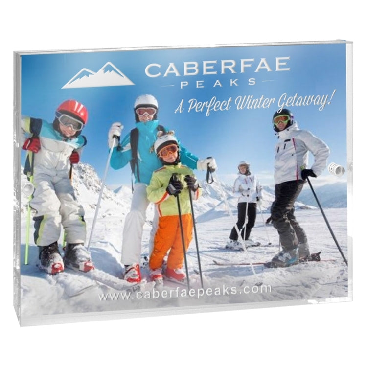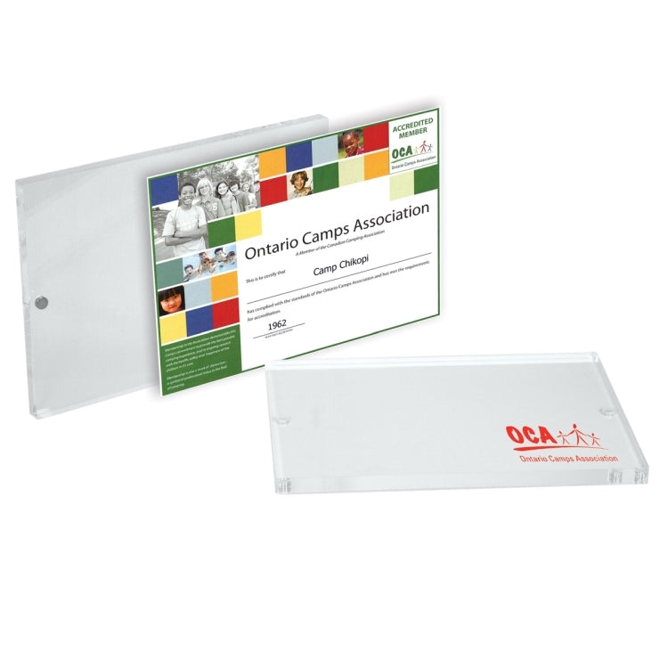 These clear acrylic frames are held together with small, but powerful, magnets. Your favorite pictures or inserts can easily be positioned inside for proud display. Choose from three popular sizes and include your Screen and laser engraved copy on the front.?