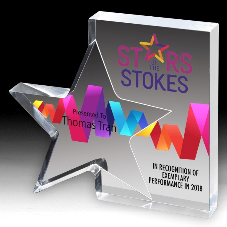 Acrylic Star Awards are a great way to recognize Star Achievers. They can be Screen Printed, Laser Engraved or 4 Color Process Printed.