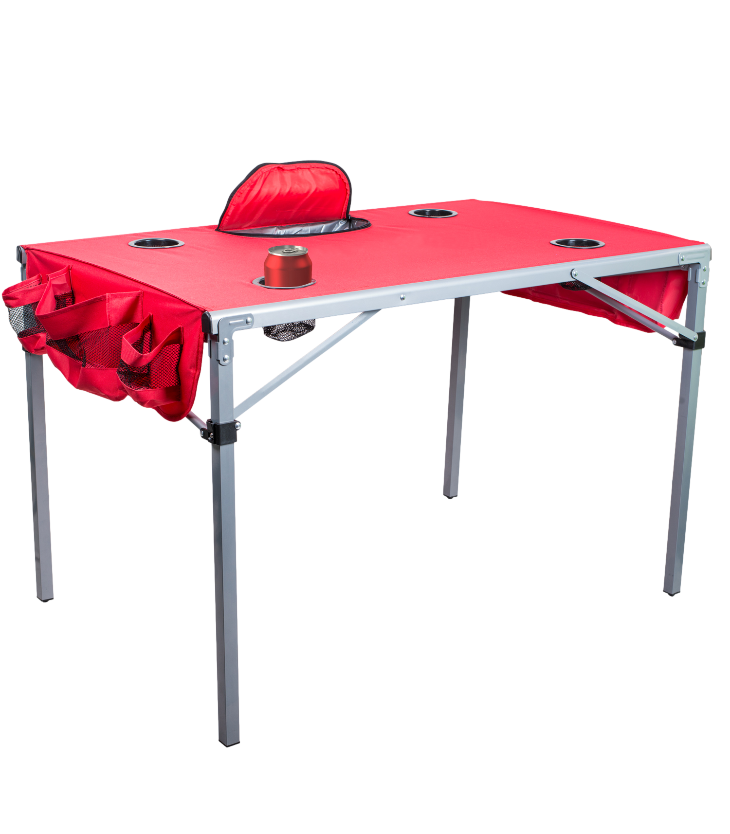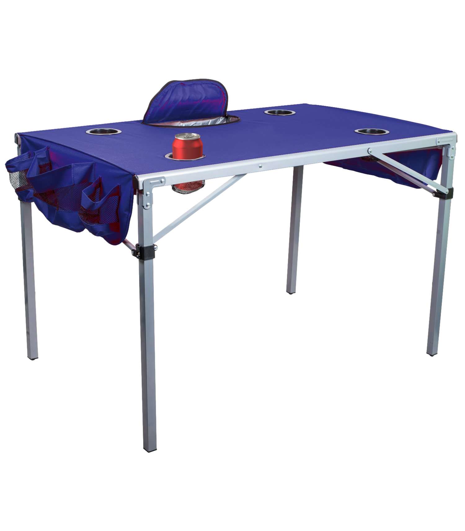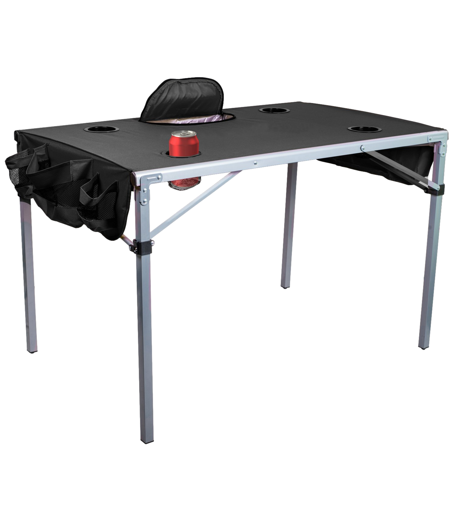 Compact and folding design, aluminum frame table with built in insulated cooler. Zippered cooler compartment. 3 pockets on each side for added storage. 600D polyester fabric with matching carry case/shoulder strap.