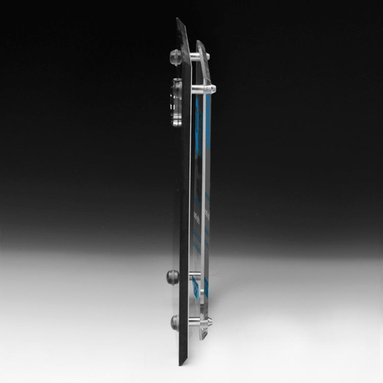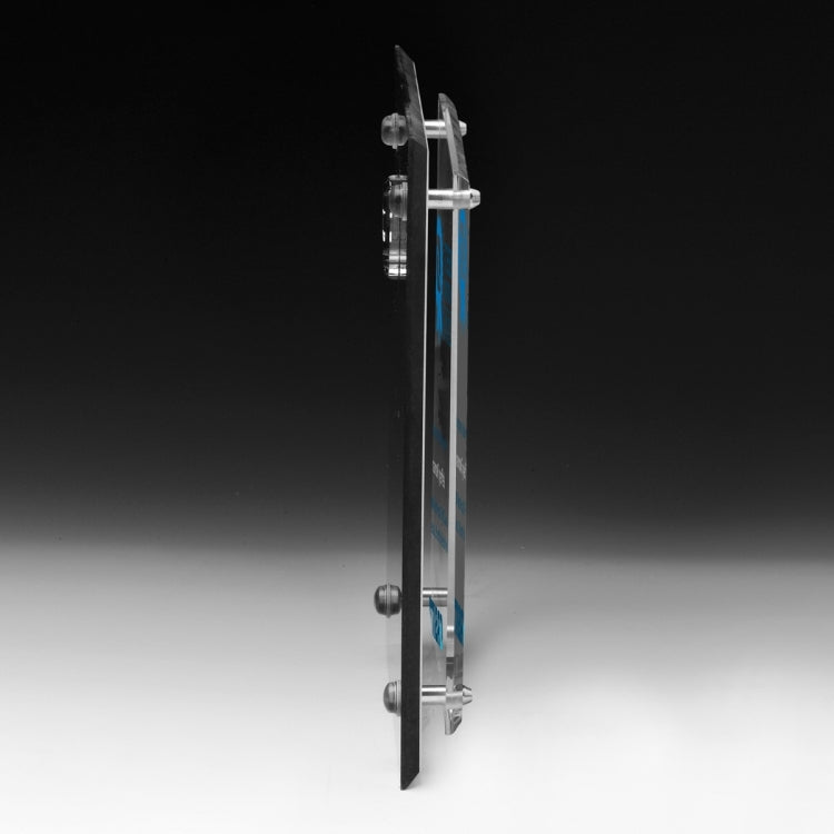 These plaques feature a finely brushed aluminum plate over beveled black acrylic with an elevated clear acrylic imprint panel and decorative chrome hardware. The clear acrylic imprint panel is decorated by Screen Printing, Laser Engraving or 4 Color Process Printed.