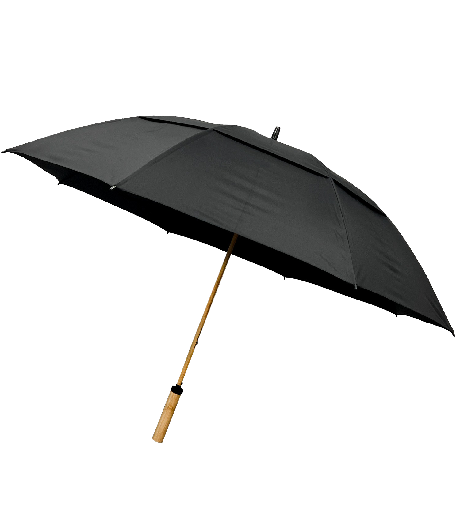 62" arc RPET Golf Umbrella with a bamboo shaft and handle. Vented for added durability in windy conditions. Comes with a sleeve with shoulder strap. With the purchase of each RPET product we sell, Peerless will donate 1% of the net proceeds to the Rainforest Action Network.