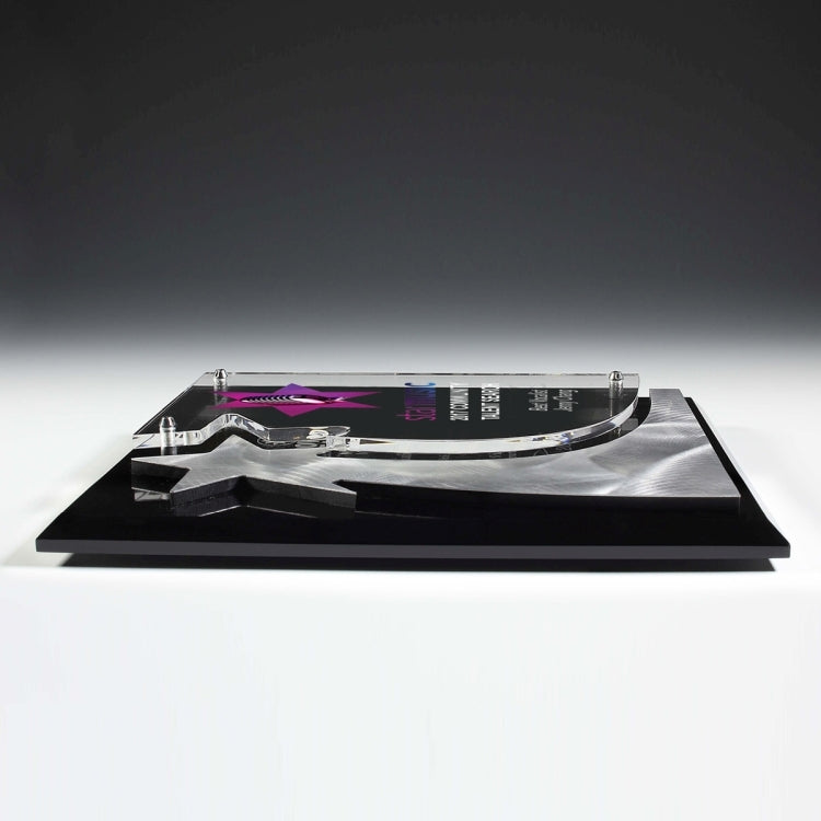 These plaques feature metal shooting stars or waves mounted on black beveled and polished acrylic with swirling metal accents. The clear acrylic imprint panel is decorated by Screen Printing, Laser Engraving or 4 Color Process Printed and is elevated and held in place with decorative chrome hardware.