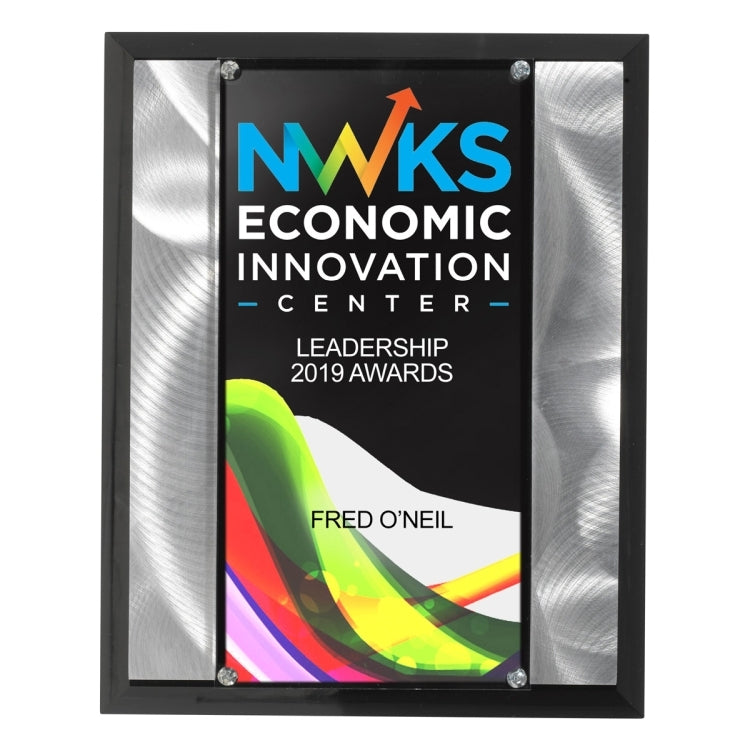 These plaques feature machined metal strips inset on finely polished black beveled acrylic. The clear acrylic imprint panel is decorated by Screen Printing, Laser Engraving or 4 Color Process Printed and is elevated and held in place with decorative chrome hardware.