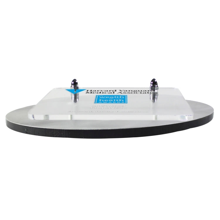 These plaques feature stunning angular swirled metal background plates with elevated acrylic panels containing your imprint and ad copy. They are held together with decorate chrome hardware. They can be Screen Printed, Laser Engraved or 4 Color Process Printed.